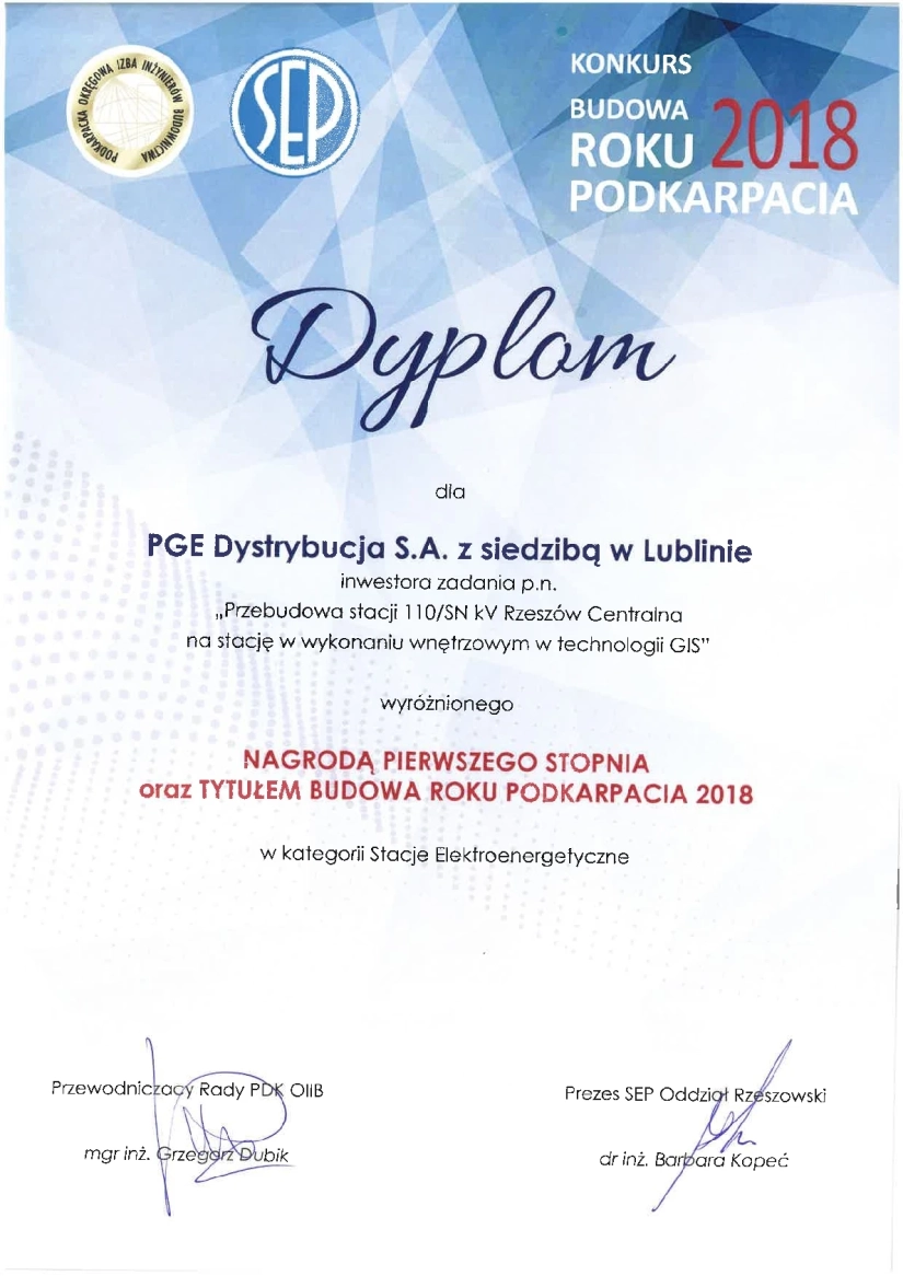 20 września w Rzeszowie odbyło się wręczenie nagród w konkursie „Budowa Roku Podkarpacia 2018” zorganizowanego przez Podkarpacką Okręgową Izbę Inżynierów Budownictwa. Nagrodę pierwszego stopnia oraz tytuł Budowa Roku Podkarpacia 2018 w kategorii Stacje Elektroenergetyczne otrzymał PGE Dystrybucja Oddział Rzeszów za realizację przebudowy stacji 110/SN kV Rzeszów Centralna.