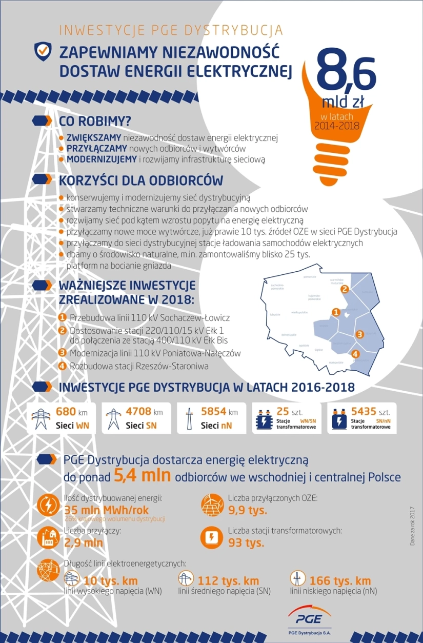PGE Dystrybucja, dostarczająca energię elektryczną do ponad 5 mln odbiorców we wschodniej i centralnej Polsce, przeznaczyła na inwestycje w infrastrukturę energetyczną w latach 2014 – 2018 ponad 8,6 mld złotych. Pozwoliło to na budowę i modernizację blisko 1182 km linii energetycznych WN 110 kV, ponad 7600 km linii SN, ponad 10 700 km linii nN, 115 stacji transformatorowych wysokiego i średniego napięcia WN/SN oraz blisko 9800 stacji SN/nN.