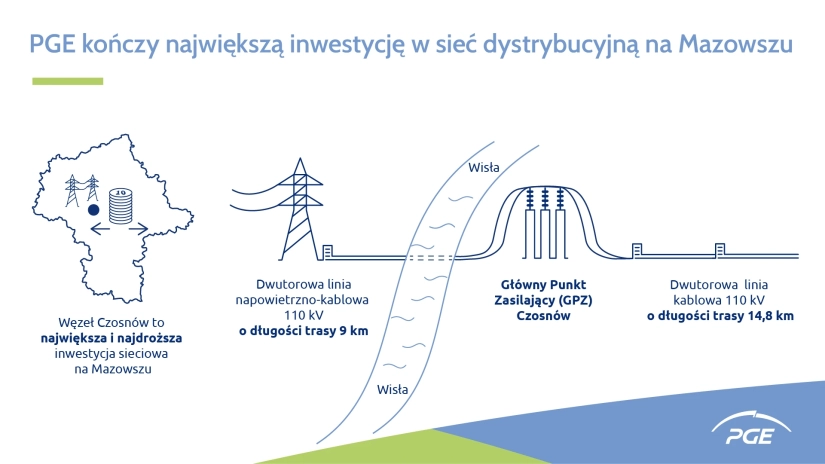 Węzeł Czosnów to najdroższa i największa inwestycja sieciowa na Mazowszu realizowana przez PGE Dystrybucja S.A. Spółka wybudowała już Główny Punkt Zasilający (GPZ) Czosnów oraz dwa tory linii kablowej 110 kV o długości 14,8 km, łączące istniejący GPZ Łomianki z nową stacją 110/15 kV w Czosnowie. Jest to aktualnie najdłuższa linia kablowa wysokiego napięcia w majątku PGE Dystrybucja.