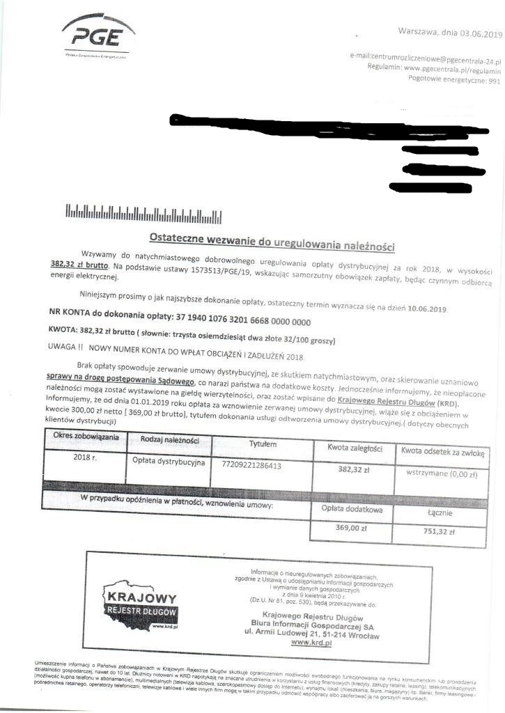 Z docierających do Spółki informacji wynika, że odbiorcy z obszaru działania PGE Dystrybucja S.A. otrzymują wezwania do uregulowania opłaty dystrybucyjnej za 2019 r. Korespondencja opatrzona jest logo PGE oraz nazwą Polska Gospodarka Energetyczna lub PGE Centrala.
