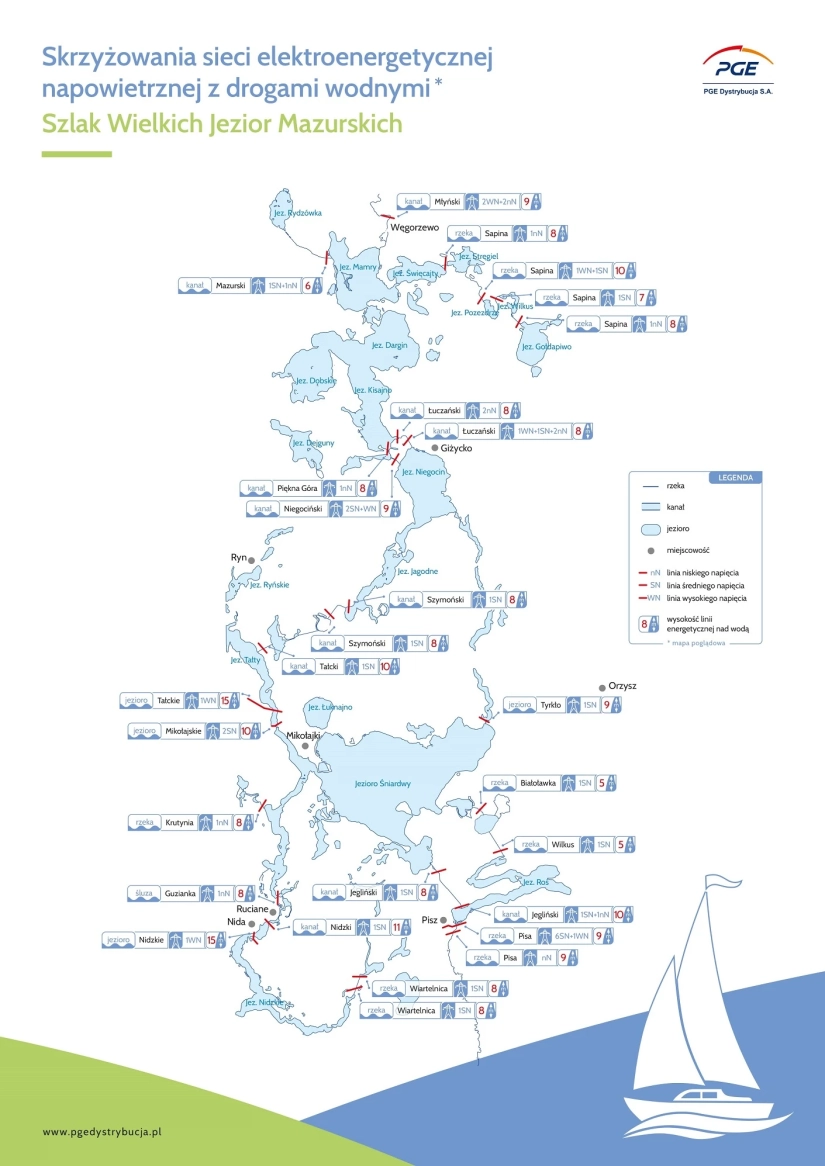 PGE Dystrybucja, kontynuując ubiegłoroczną kampanię informacyjną, służącą poprawie bezpieczeństwa żeglarzy na Mazurach i Suwalszczyźnie oraz wychodząc naprzeciw oczekiwaniom turystów i osób korzystających z akwenów wodnych regionu, naniosła linie energetyczne na mapę szlaków żeglownych. Mapy zostały już udostępnione sternikom.
