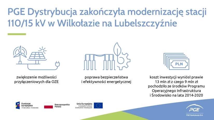 Zwiększenie możliwości przyłączeniowych dla OZE, uelastycznienie systemu czy poprawa bezpieczeństwa i efektywności energetycznej – to korzyści, które odczują mieszkańcy okolic Kraśnika dzięki modernizacji głównego punktu zasilania (GPZ) Wilkołaz. Koszt inwestycji wyniósł prawie 13 mln zł a część tej kwoty pochodziła ze środków Programu Operacyjnego Infrastruktura i Środowisko na lata 2014-2020.