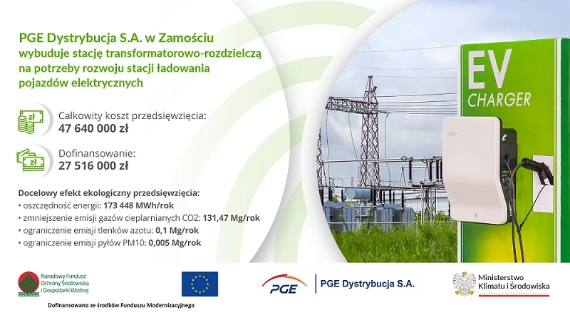 PGE Dystrybucja, spółka z Grupy PGE, otrzyma z Narodowego Funduszu Ochrony Środowiska i Gospodarki Wodnej (NFOŚiGW) dofinansowanie w kwocie ponad 27,5 mln zł w ramach Funduszu Modernizacyjnego. Środki zostaną przeznaczone na budowę stacji transformatorowo - rozdzielczej w Zamościu. Całkowity koszt inwestycji wyniesie ponad 47,6 mln zł.