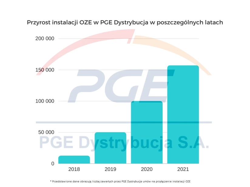 Miniony rok całkowicie zdeklasował lata poprzednie. Wydane przesz Spółkę warunki przyłączenia instalacji otrzymało ponad 157 tys. Odbiorców, co podwaja liczbę dotychczasowych prosumentów w sieci PGE Dystrybucja. Przyłączonych przed końcem roku zostało niewiele mniej, bo ponad 141 tys. mikroinstalacji.