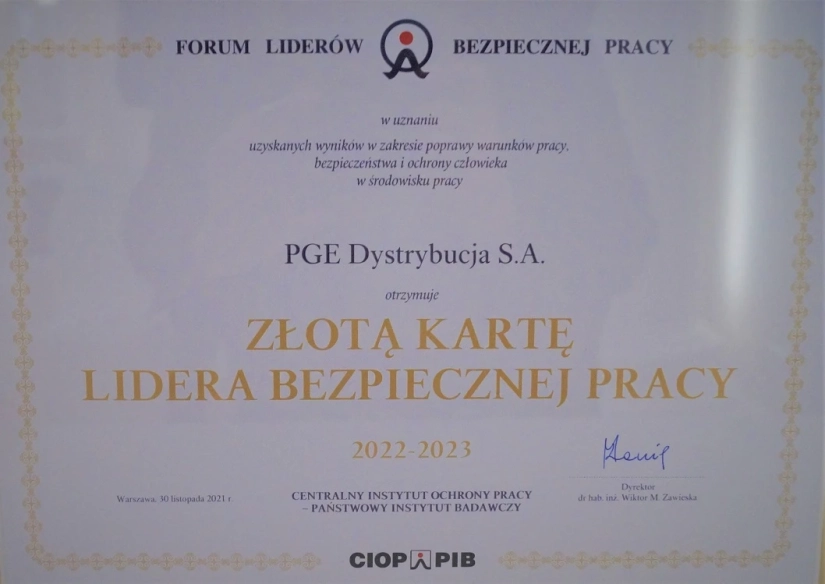 28 kwietnia to Światowy Dzień Bezpieczeństwa i Ochrony Zdrowia w Pracy. PGE Dystrybucja znajduje się w gronie Liderów w tej dziedzinie – Spółka została nagrodzona Złotą Kartą Lidera Bezpiecznej Pracy na lata 2022-2023.