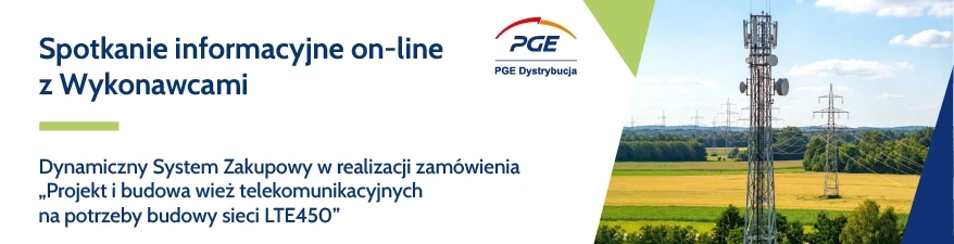 PGE Dystrybucja S.A. zaprasza do udziału w spotkaniu on-line Wykonawców rozważających udział w Dynamicznym Systemie Zakupów (DS), którego przedmiot stanowić będzie „Projekt i budowa wież telekomunikacyjnych na potrzeby budowy sieci LTE450”.